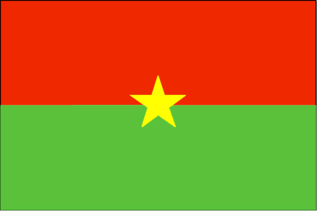 布基纳法索国旗呈长方形,长与宽之比为3∶2。由上红下绿两个平行相等的横长方形组成,旗面中央有一颗金黄色的五角星。红色象征革命,绿色象征农业、土地和希望;五角星象征革命向导,金黄色象征财富。1909年沦陷为法国殖民地.1958年12月成为法兰西共同体的自治共和国,指定黑,白,红三色国旗.1960年8月5日宣告独立,取国名为上沃尔特。1984年8月,更改国名为 布基纳法索,并重新制定上述红,绿双色国旗,沿用至今。