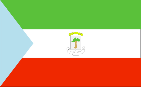 赤道几内亚国旗呈长方形,长与宽之比为5:3。靠旗杆一侧为蓝色等腰三角形,右侧为三个平行宽条,自上而下分别为绿、白、红三色,旗面中央有国徽图案。绿色象征财富,白色象征和平,红色象征为独立而斗争的精神,蓝色象征海洋。