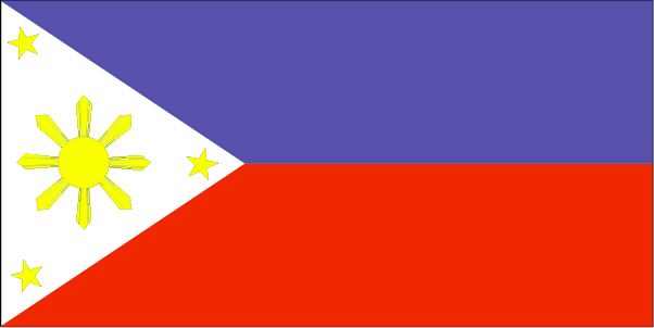 菲律宾共和国国旗是在反抗西班牙殖民统治、争取自由和独立的斗争中制定的。上半部为蓝色,下半部为红色,左边为一个白色等边三角形。三角形中央有一个黄色的太阳,周围有八道长的光线和一些较短的光线;三角形的每个角落各有一颗黄色的五角星。蓝色代表和平、真理和正义;红色代表爱国心和勇敢;白色等边三角形代表平等。三角形里的太阳代表自由,表示阳光普照全国。八道光线代表1986年最先拿起武器反抗西班牙统治的八个省,其余的光线代表其他各省。三颗星象征菲律宾群岛的三大区域----吕宋、米沙鄢和棉兰