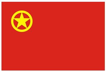 (2)黄圈围着的黄色星,缀在旗面左上方。制作时,先将旗面对分为四个相等的长方形,将左(它的反面为右)上角长方形上下分为十二等分,再以左上角长方形中心点为圆心,三等分及四等分长为半径画两圆周,两圆周之间就是黄色圆圈。再在内圆周上定出五个等距离的点,其中一点位于圆周正上方。将此五点中各相隔的两点相联成直线。此五直线之外轮廓线就是黄色五角星之外缘。