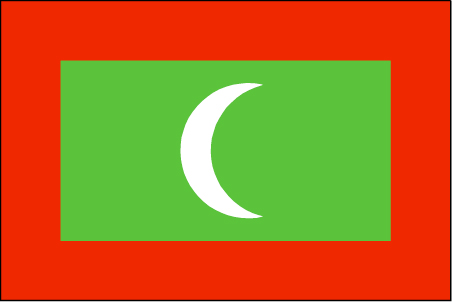 呈长方形,长与宽之比为3∶2。国旗由红、绿、白三种颜色组成。旗地为绿色长方形,四周为红边。红边的宽度为全旗宽度的四分之一,绿色长方形的宽度为全旗宽度的一半。 一牙白色新月位于绿色长方形的正中。红色象征为国家主权和独立而献身的民族英雄的鲜血;绿色意味着生命、进步和繁荣;白色新月表示和平、安宁和马尔代夫人民对伊斯兰教的信仰。