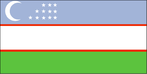 乌兹别克斯坦国旗呈横长方形,长与宽之比为2∶1。自上而下分别为浅蓝、白、浅绿三色平行宽带,在白色和浅蓝、浅绿色宽带之间为两道红色细条。在浅蓝色宽带左侧有一弯白色新月和12颗白色五角星。乌兹别克斯坦于1924年成为原苏联的一个加盟共和国,1952年起采用的国旗与原苏联国旗相似,乌兹别克斯坦国旗只是旗面中间有一道蓝色宽条,其上下各有一白色窄条。1991年8月31日通过了乌兹别克斯坦国家独立法,10月11日开始启用上述国旗。